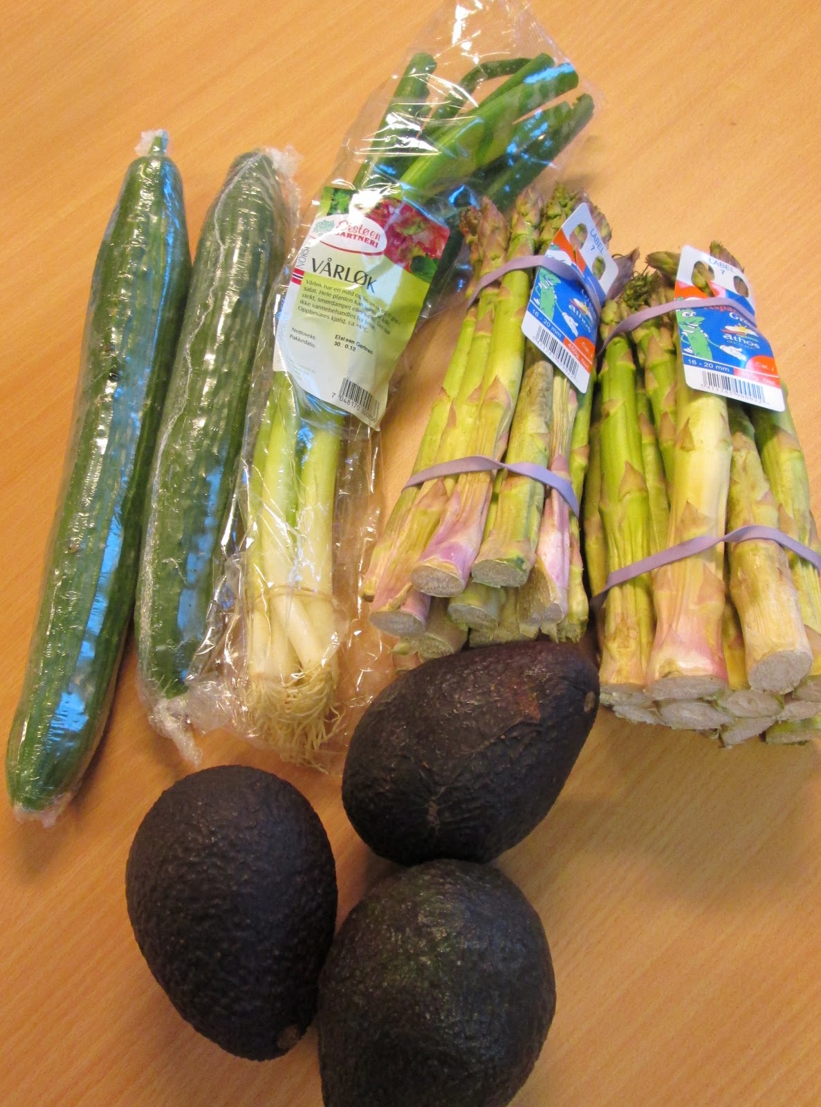 6. Skjær salma i tynne skiver. Del agurk og asparges på langs, og avokado i tynne skiver.